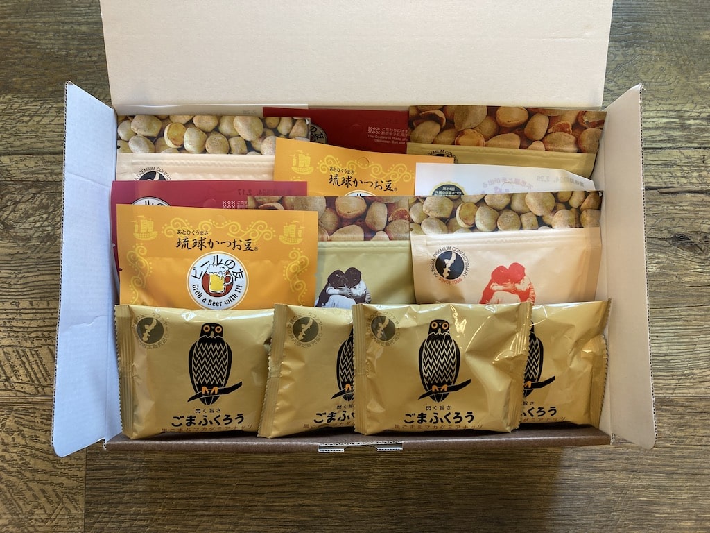 オキネシアのオリジナル菓子6種類を詰め合わせました。カリッと焼き上げたピーナツやマカダミアナッツに、サクサクの衣を纏わせたぴりんぱらん、ナンチチ、勝つお豆。たっぷりの黒ごまとマカダミアナッツが香ばしいごまふくろう。おやつやお茶請けに、お酒のお供にもどうぞ。