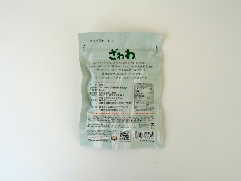 黒糖は、さとうきびの搾り汁をそのまま煮詰めて冷やし固めたもの。精製の過程で失われるミネラル分が、除去されることなく豊富に含まれています。味わいは少しエグミがあって、甘みだけではない独特の味覚です。沖縄のマラソン大会では差し入れとしても定番の黒糖。ミネラル補給に打ってつけです。各種スポーツ、ハイキングやトレッキングのお供にいかがですか。