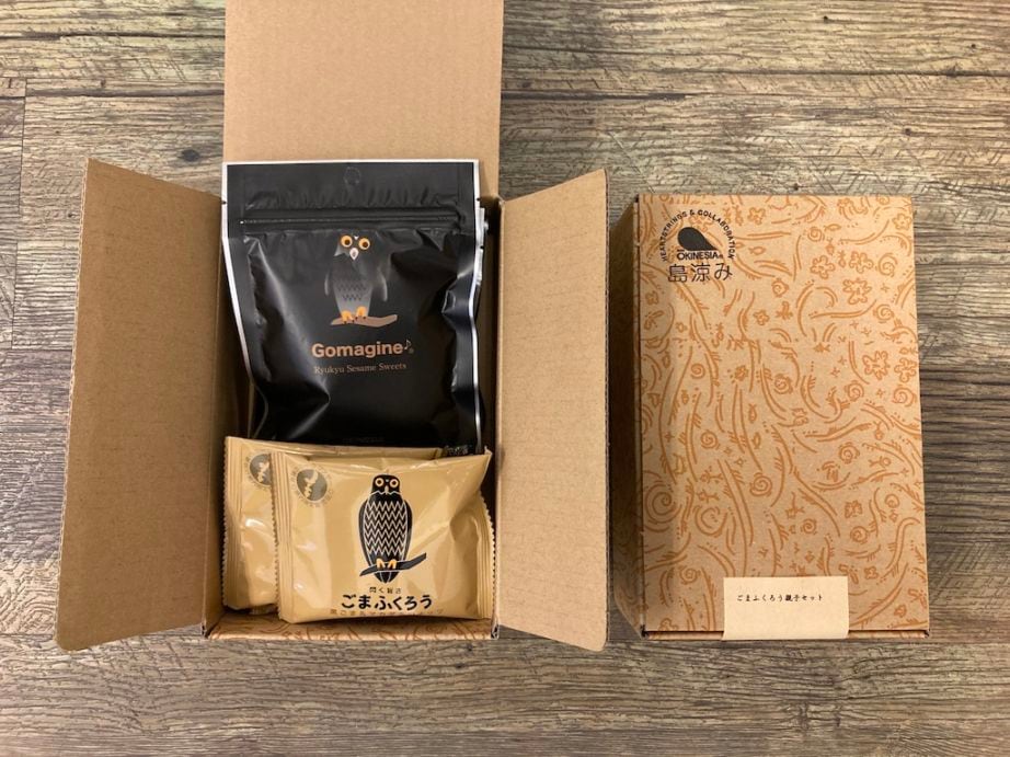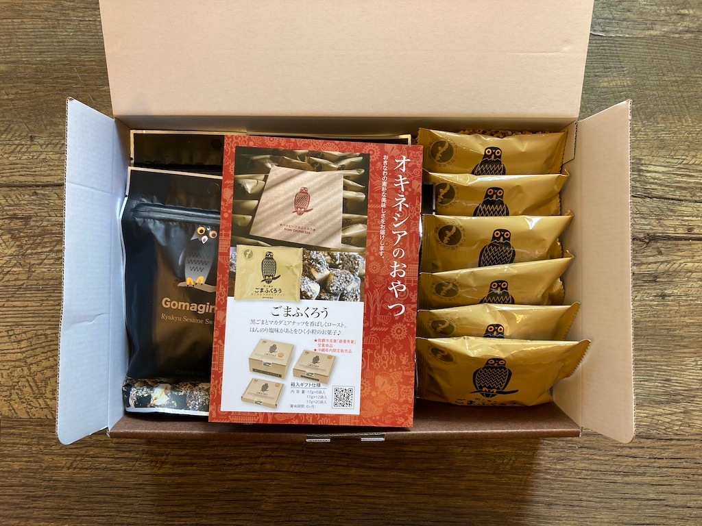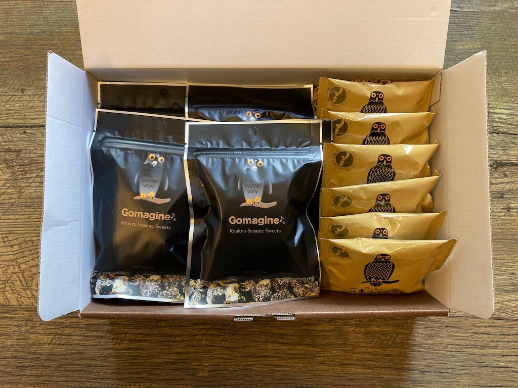 黒ごまとマカダミアナッツの深い味わい、ごまふくろう。ヘーゼルナッツ の香ばしさにココナッツミルクのアクセントが新鮮な、ごまじん。ごまふくろうのパッケージや個包装に描かれたフクロウは、リュウキュウアオバズクといって、沖縄県のレッドデータブックで準絶滅危惧種に分類されている希少動物なのです。そしてごまじんはというと、リュウキュウアオバズクの子供。お母さんのごまふくろうが大のビートルズファンで、大好きなあの曲にちなんで名前をつけたそうです。子守唄だったそうな…。